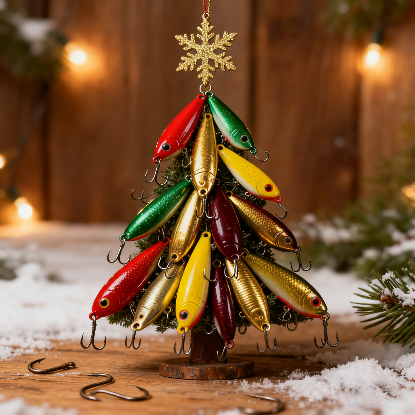 • Material: Authentic fishing lures, hooks, and metallic ornaments 🎣